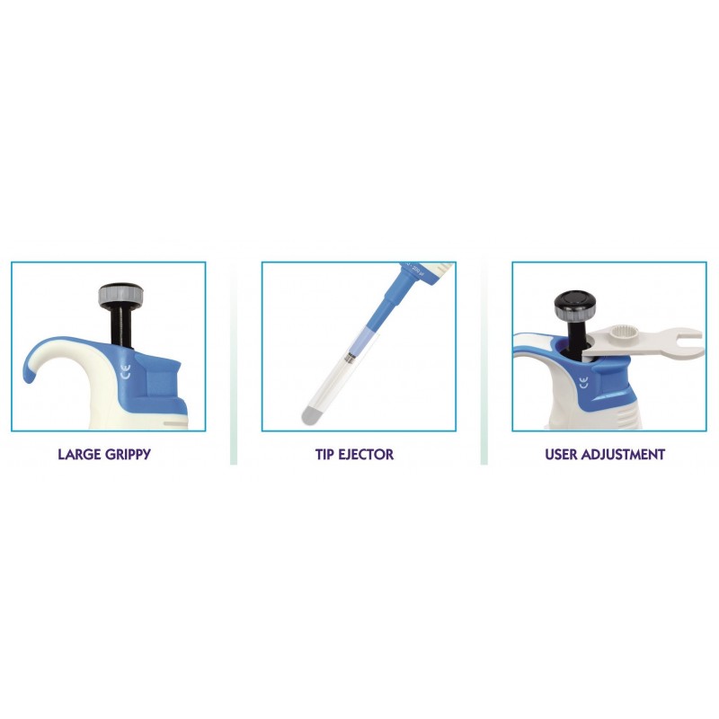 Tip Ejector: Built-in streamlined tip ejector facilitates easy tip ejection and access to narrow necked bottles and tubes.